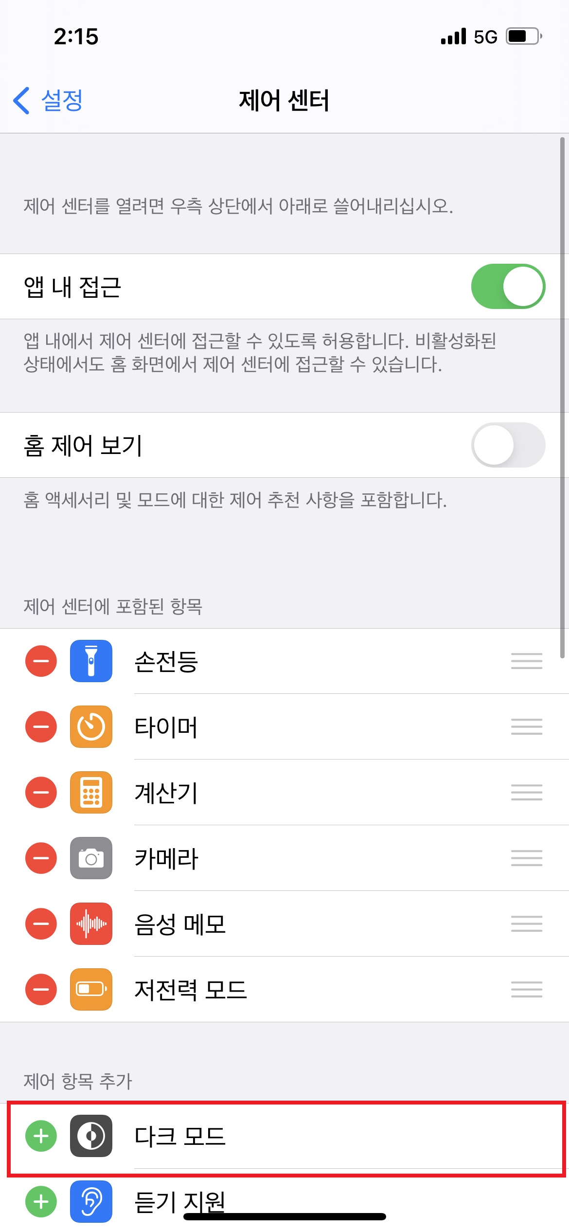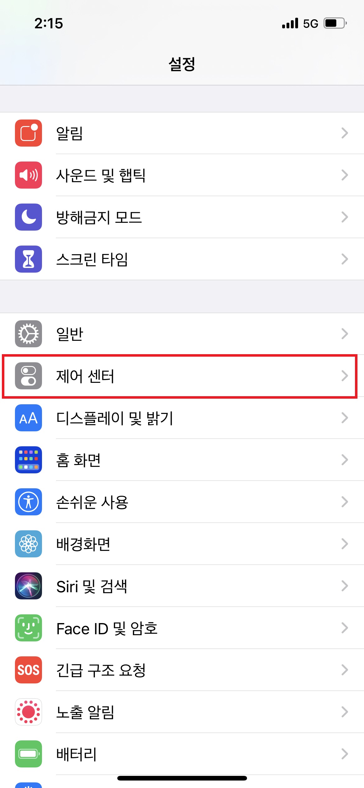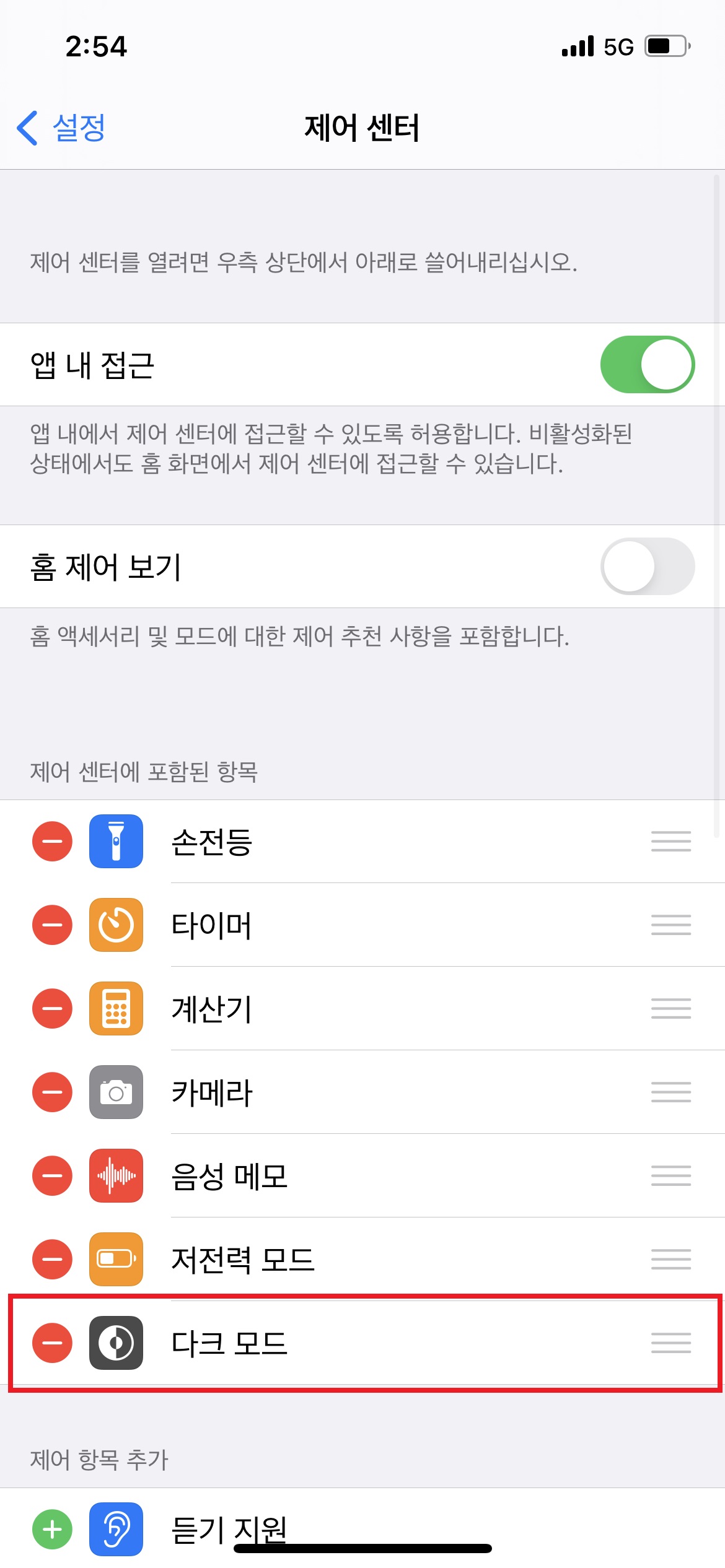 아이폰 우측 상단을 쓸어내리면 나타나는 제어 센터에 항목을 추가하는 방법입니다.