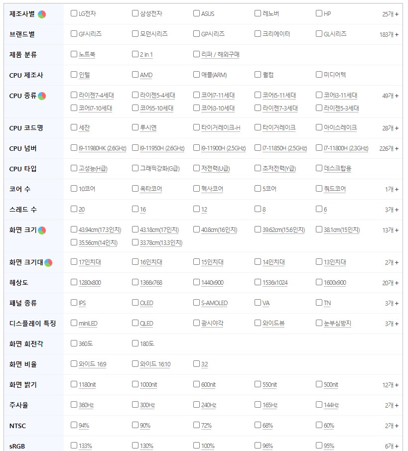 - ~13인치: 대부분 저사양 노트북입니다. 적당한 가격대에서는 이 정도 화면에서 성능을 기대하기 어렵습니다.