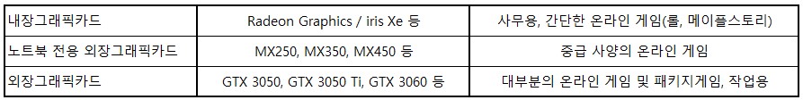 내장그래픽카드는 11세대 이상의 i5에 포함된 GPU나 4세대 이상의 Ryzen에 포함된 GPU라면 간단한 온라인 게임을 원할하게 구동할 수 있습니다. Nvidia에서 제작한 MX 시리즈는 노트북에만 탑재됩니다. 내장그래픽카드의 퍼포먼스로는 돌리기 힘든 게임을 구동할 수 있도록 해줍니다. 예를 들어 배틀그라운드의 경우 내장그래픽카드로는 실제로 플레이가 불가능할 정도로 프레임저하가 심하지만, MX 시리즈가 탑재된 노트북은 낮은 옵션으로 플레이가 가능합니다. 하지만 쿠다가속과 같이 외장그래픽카드의 성능 지원을 통한 영상 작업을 하기 위해서는 Nvidia에서 제작한 GTX 시리즈가 탑재된 노트북을 구매하여야 합니다. 내장그래픽카드로는 순수하게 CPU의 연산능력으로만 작업을 처리해야하며, 이는 CPU에 큰 부하를 주어 장시간 작업에 불편함을 줍니다. 따라서 많은 수의 코어를 가지고 있는 그래픽카드의 도움은 필수적입니다.
