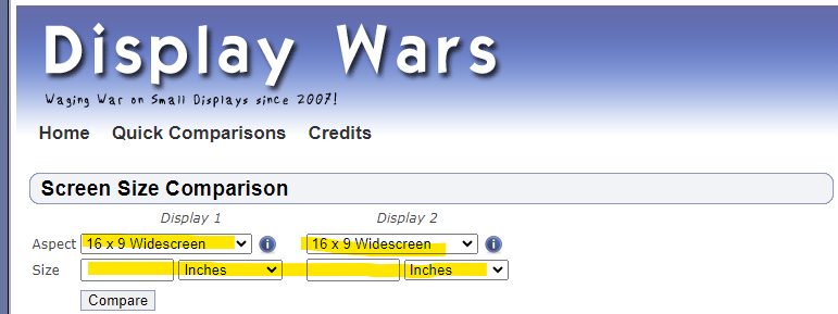 Uses Choose between two sizes Can't decide between a 50 inch HD TV and a 65 inch 4K model or a 10 inch iPad and a 7 inch Android Tablet? Display Wars will show you graphically just how big the size difference really is. Compare your current TV Comparing a