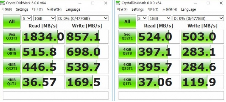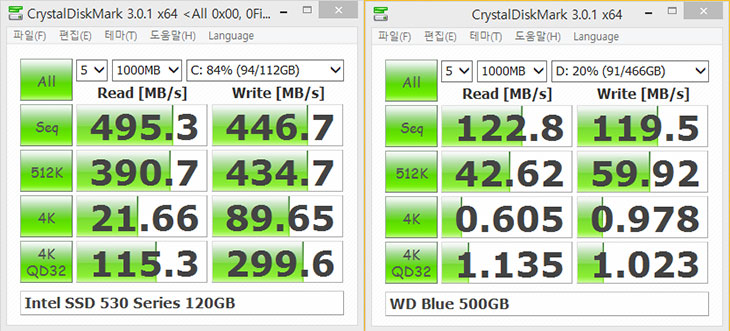 SSD가 월등히 빠릅니다. 큰 파일을 읽는 속도라 할 수 있는 순차 읽기/쓰기의 속도가 SATA 인터페이스 기준으로 4배 정도의 차이를 보입니다. 하지만 무엇보다도 SSD의 체감 속도를 빠르게 하는 것은 4K 읽기/쓰기속도입니다. 작은 파일 여러 개를 로드하는 4K 속도는 곧 일반적인 프로그램(OS 및 기타 응용프로그램)을 사용하는데 큰 영향을 미치는데, 그 차이는 아무리 적어도 20배의 차이를 보입니다. 즉 컴퓨터에 영향을 미치는 모든 속도 요소에서 SSD가 빠르다고 보시면 됩니다.
